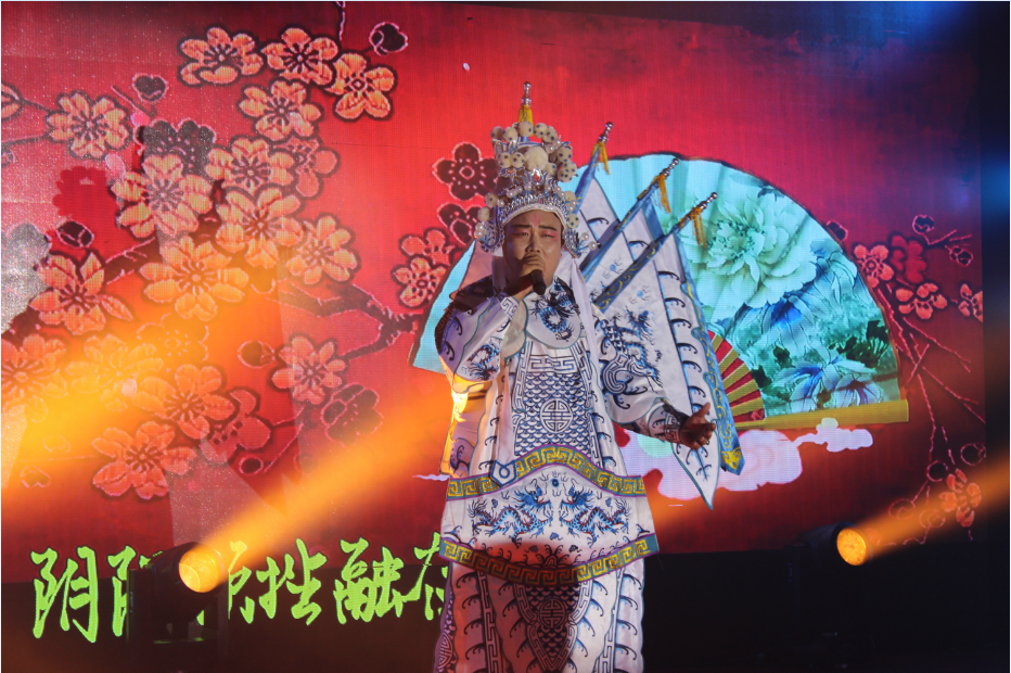 第二個節(jié)目是由牛懷賓帶來的《粉墨人生》,他身著戲袍,走著臺步,為偉大的信橋慶生。
